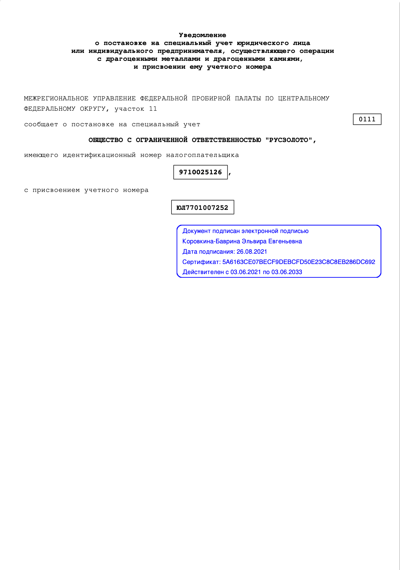Уведомление о постановке на специальный учет
